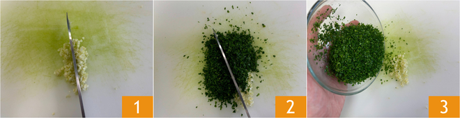 Para preparar as sobrecoxas crocantes, primeiro pique o alho 1 e a salsinha 2 com uma faca e misture-os 3.