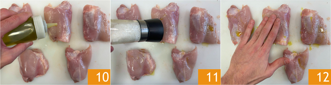 Tempere as sobrecoxas com óleo 10, sal e pimenta 11. Certifique-se de que o tempero cubra toda a superfície, massageando-as com as mãos 12.