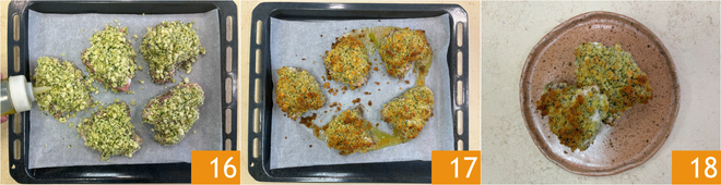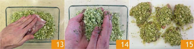 Passe-as na farinha de rosca 13, garantindo que adira de todos os lados 14 15.