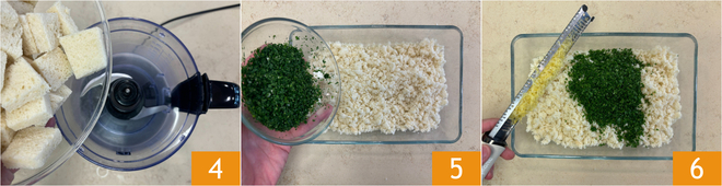 Coloque o pão de forma em um mixer 4 e bata até obter migalhas. Transfira tudo para um recipiente grande e adicione o alho e a salsinha picados 5 e as raspas de limão 6.