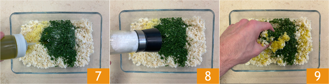 Despeje o óleo 7 e ajuste o sal 8. Misture com as mãos para integrar todos os ingredientes 9.