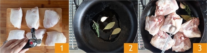 Para preparar as sobrecoxas de frango na frigideira, como primeira coisa, elimine eventuais penas queimando-as com um maçarico 1; alternativamente, você pode arrancá-las ou passar as sobrecoxas perto da chama do fogão. Em uma frigideira grande, aqueça um fio de óleo com o alho com casca, o tomilho e o louro 2. Deixe apurar, tendo cuidado para não queimar o alho; quando estiver bem quente, adicione o frango, posicionando-o com a pele para baixo 3.