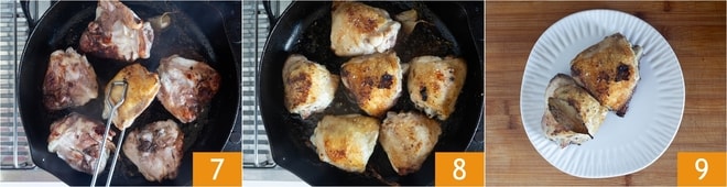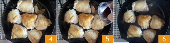 Deixe dourar por cerca de 5 minutos em fogo alto, depois vire as sobrecoxas 4 e regue com o vinho 5. Cozinhe em fogo baixo por cerca de 20 minutos 6, adicionando um pouco de água se necessário.