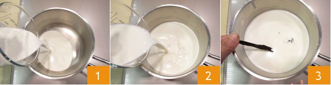 Para preparar o vanilla pudding, despeje o creme de leite 1 e o leite em uma panela 2, depois adicione a vagem de baunilha junto com as sementes internas que você raspou com a lâmina de uma faca 3. Leve a mistura para ferver em fogo baixo.