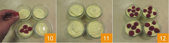 Adicione 4 framboesas a cada copo 10, depois cubra com o restante da mistura 11 e decore a gosto com as framboesas restantes 12. Cubra com filme plástico e leve à geladeira para firmar por pelo menos 6 horas: seu vanilla pudding está pronto para ser servido!