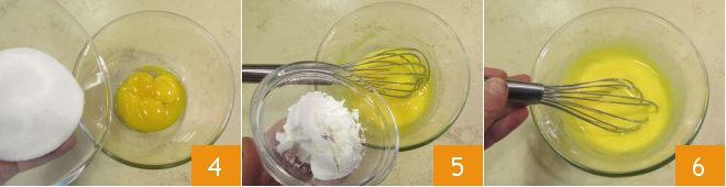 Em uma tigela à parte, despeje as gemas e o açúcar 4, misture com um batedor e adicione também o amido de milho 5. Continue trabalhando com o batedor até obter uma mistura lisa e homogênea 6.