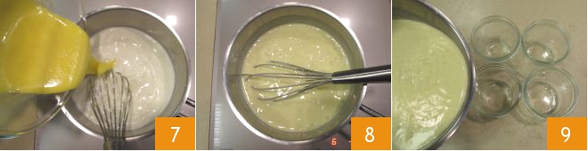 Quando o leite e o creme de leite estiverem prestes a ferver, remova a vagem de baunilha e despeje a mistura de gemas, mexendo com o batedor 7. Continue mexendo em fogo baixo por alguns minutos, até que o creme esteja espesso 8. Pegue 4 copos com capacidade de 180 g cada e encha-os até a metade com o creme obtido 9.