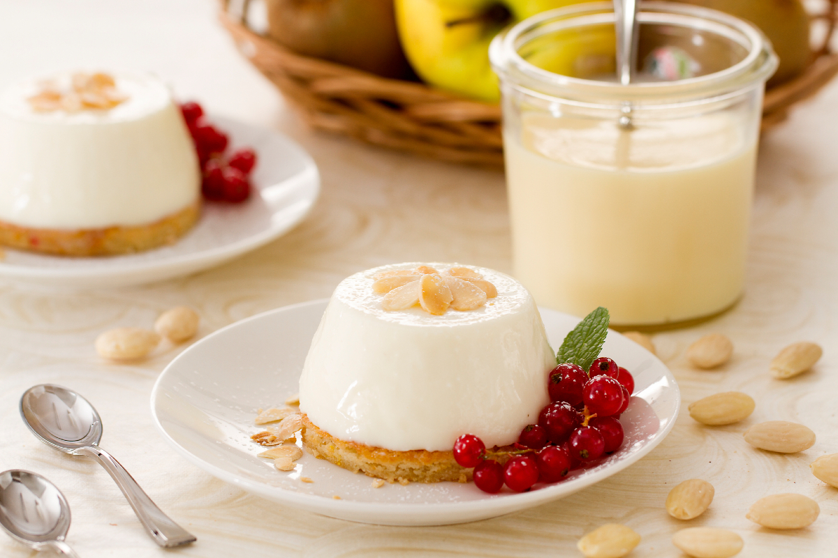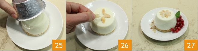 depois vire-o depositando-o sobre o biscoito 25. Seu delicioso doce de leite está pronto; antes de servir, decore a gosto com lâminas de amêndoas 26 e groselhas 27.