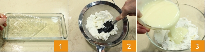 Para fazer o doce de leite, comece colocando a gelatina em água fria por cerca de 10 minutos para amolecê-la 1. Peneire a ricota em uma tigela grande para evitar a formação de grumos na mistura 2 e junte o leite condensado 3.