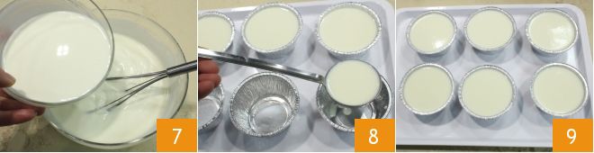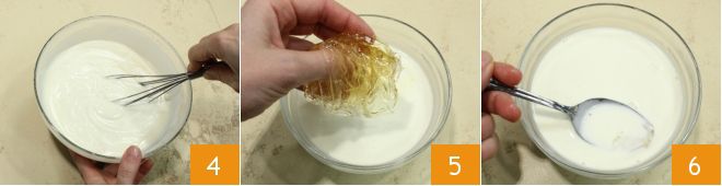 Misture bem a preparação com um batedor 4. Esprema bem a gelatina que você deixou de molho e dissolva-a no creme de leite morno 5; mexa com uma colher até que esteja completamente dissolvida 6.