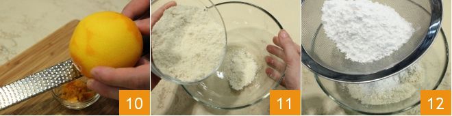 Enquanto isso, ocupe-se do biscoito que acompanhará o doce: rale a casca de uma laranja 10 e reserve. Em uma tigela, coloque as amêndoas picadas 11 e junte o açúcar de confeiteiro peneirado 12,