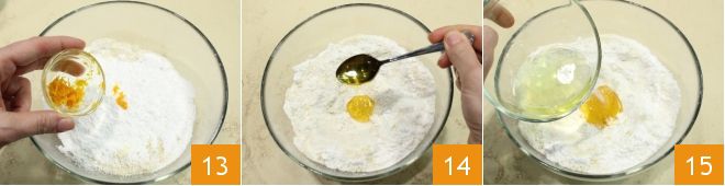 aromatize com a casca de laranja ralada 13 e uma colher de chá de mel 14; por último, acrescente uma clara de ovo 15 e uma pitada de sal.