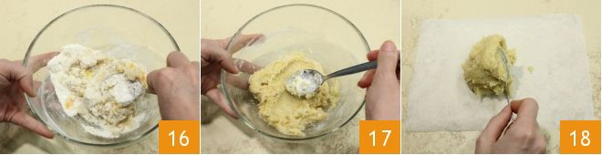 Agora misture a massa com uma colher 16 até obter uma mistura compacta e bem homogênea 17. Coloque sobre a bancada uma folha de papel-manteiga e transfira a massa com uma colher para o papel 18