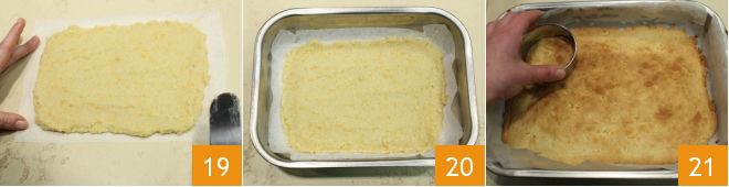 e espalhe, dando-lhe uma forma retangular de aproximadamente 18 x 25 cm 19. Transfira a base de biscoito para uma assadeira retangular um pouco maior 20 e asse em forno estático pré-aquecido a 180°C por 15 minutos (ou em forno ventilado a 160°C por cerca de 10 minutos). Quando a superfície do biscoito estiver dourada, retire do forno e deixe esfriar. Uma vez frio, recorte discos com um cortador redondo de 8 cm de diâmetro 21.