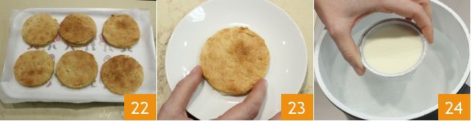Você obterá 6 discos de biscoito 22. A partir daqui você pode montar sua sobremesa: coloque em um prato de sobremesa um biscoito 23, desenforme o doce de leite — para facilitar essa operação, mergulhe-o por alguns instantes em uma tigela com água quente 24,