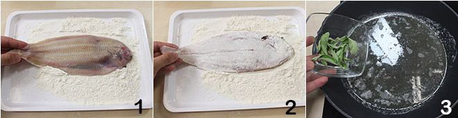 Para preparar o linguado com manteiga e sálvia, comece pela limpeza dos linguados: limpe, descasque e lave os linguados, depois deixe-os escorrer e seque-os delicadamente (para mais detalhes sobre a limpeza do linguado, você pode consultar o guia na escola de culinária clicando aqui). Enfarinhe bem os linguados de ambos os lados e coloque-os em um prato (1-2). Em uma frigideira antiaderente, derreta a manteiga em fogo baixo e adicione as folhas de sálvia 3,