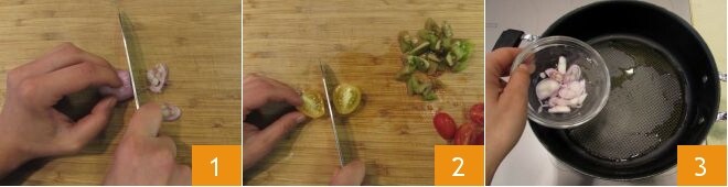 Para preparar a sopa de três tomates, comece limpando e fatiando a cebola échalote 1, depois lave e corte em gomos os tomates camone, pela metade os tomatinhos pizzutello e os tomatinhos amarelos 2. Em uma panela, coloque um fio de azeite e adicione a cebola 3; refogue mexendo de vez em quando.