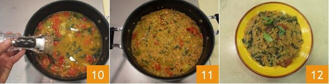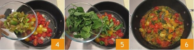 Em seguida, adicione os tomates 4, misture e adicione também as folhas de manjericão e o espinafre 5. Cozinhe tudo em fogo baixo por 10 minutos 6, mexendo de vez em quando.