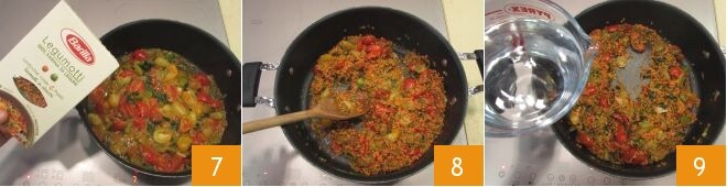 Despeje diretamente na panela os grãos de farinha de leguminosas 7, misture 8 e adicione a água 9,