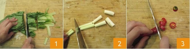 Para preparar a sopa com almôndegas de porco e gengibre, primeiro coloque a água para ferver em uma panela grande, depois passe para a preparação dos ingredientes para o caldo. Lave as acelgas, elimine a parte final dos talos e corte-as grosseiramente em pedaços 1. Lave os talos de capim-limão, remova as extremidades e corte-os em pedaços grandes 2. Por fim, lave a pimenta e corte-a em rodelas 3.