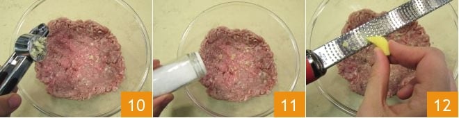 Enquanto isso, você pode preparar as almôndegas: coloque a carne moída de porco em uma tigela grande, adicione o dente de alho amassado 10, sal 11, pimenta, o gengibre ralado 12