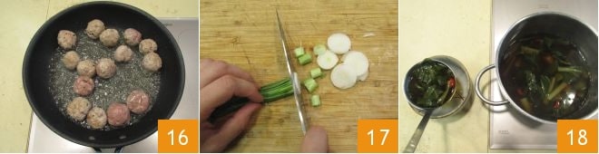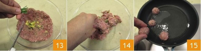 e a cebolinha picada finamente 13, depois misture a mistura com as mãos 14 e forme bolinhas com cerca de 3 cm de diâmetro. Aqueça o óleo de sementes em uma frigideira, coloque as almôndegas dentro 15