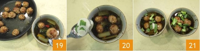 depois adicione cerca de 4 almôndegas por pessoa 19 e decore com cebolinha fresca 20. Sua sopa com almôndegas de porco e gengibre está pronta para ser apreciada bem quente 21!