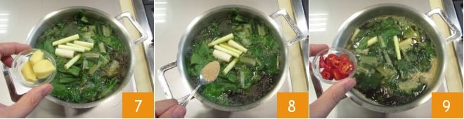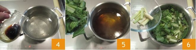 Quando a água estiver fervendo, adicione o molho de soja 4, as acelgas 5, o capim-limão 6,