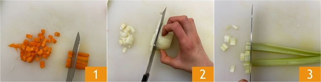 Em seguida, prepare o Caldo de legumes. Quando estiver pronto, coe-o se necessário e mantenha-o quente, de modo a tê-lo pronto para usar durante o cozimento. Descasque a cenoura e corte-a em cubinhos de meio cm 1. Faça o mesmo com a cebola 2 e os talos de aipo 3. Reserve também um punhado de folhas verdes de aipo, que usaremos depois.