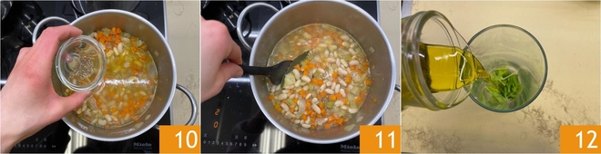 Acrescente também as sementes de funcho 10, mexa 11 e continue o cozimento em fogo bem baixo por cerca de uma hora e meia, mexendo de vez em quando e adicionando caldo quando necessário. Para obter uma sopa bem cremosa, você pode prolongar o cozimento até 3 horas, acrescentando mais caldo. Enquanto isso, prepare o óleo de aipo: coloque as folhas verdes do aipo no copo do mixer e adicione o azeite extravirgem 12.