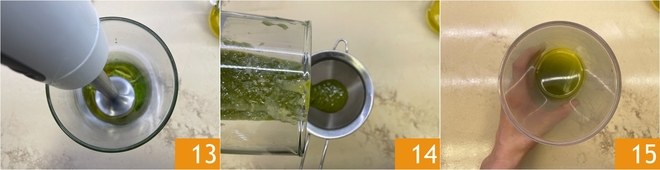 Bata até obter uma mistura homogênea 13. Coe o óleo obtido com uma peneira de malha fina 14 e reserve 15.
