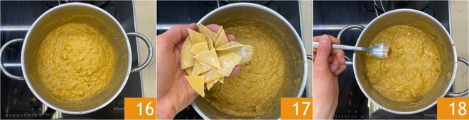 A sopa estará pronta quando os feijões se desmancharem, contribuindo para deixar a sopa naturalmente densa e cremosa 16. Neste ponto, acrescente os maltagliati diretamente na panela 17 e deixe-os cozinhar no líquido da sopa, mexendo de vez em quando; levarão cerca de 6 minutos. Se necessário, adicione mais caldo. Junte também uma pitada de pimenta 18.