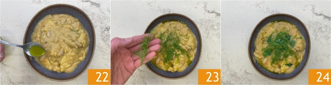 Sirva nos pratos e finalize com algumas gotas do óleo de aipo 22, uma pitada de pimenta-do-reino moída e, se desejar, um pouco de funcho 23. Sirva a sopa cremosa de feijão cannellini com maltagliati bem quente 24!