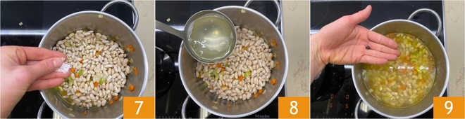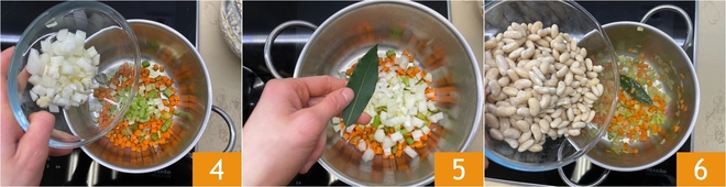 Despeje um fio de azeite extravirgem em uma panela grande e aqueça em fogo baixo. Adicione a cenoura, o aipo e a cebola 4. Junte também uma folha de louro 5 e deixe o refogado dourar delicadamente, mexendo de vez em quando, até que os legumes fiquem macios e perfumados, sem pegar cor. Em seguida, acrescente os feijões cannellini escorridos 6.