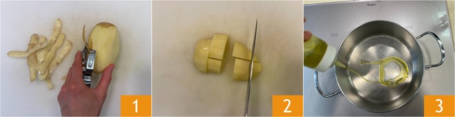 Para preparar a sopa de arroz e batata, descasque as batatas 1 e corte-as em cubos de cerca de 2 cm 2. Enquanto isso, despeje o óleo em uma panela grande 3.