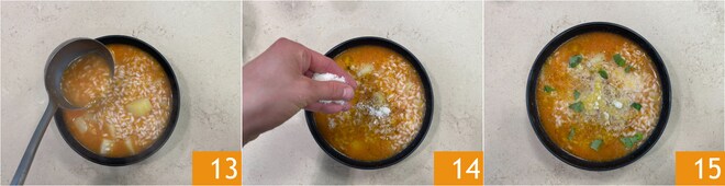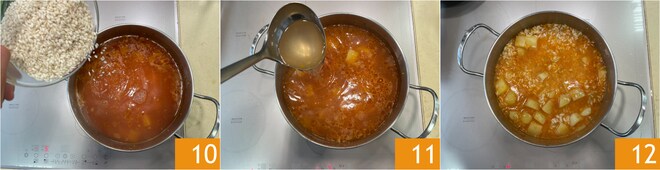 Quando as batatas estiverem cozidas, adicione o arroz 10, cozinhe conforme o tempo indicado na embalagem e adicione mais caldo conforme necessário 11. A sopa de arroz e batata está pronta 12.