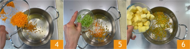 Adicione a cenoura picada 4, cebola e aipo 5. Deixe refogar por alguns minutos e, em seguida, adicione as batatas 6.