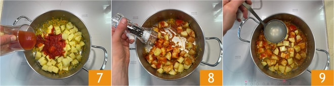 Tempere com o purê de tomate 7, sal, pimenta 8 e cubra com Caldo de legumes quente 9, cozinhe por 20 minutos, ou o tempo necessário para amolecer as batatas.