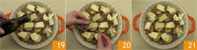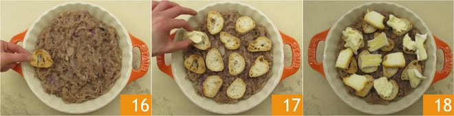 Neste ponto, as cebolas devem estar prontas, transfira-as para uma travessa apropriada e distribua as fatias de pão 16, depois comece a guarnecer com os queijos 17 misturando-os entre si e criando combinações saborosas 18.