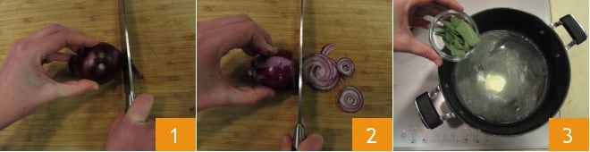 Para preparar a sopa de cebola com 4 queijos, comece pela limpeza das cebolas. Utilizamos as douradas, as brancas e as roxas. Comece pelas últimas, descasque-as 1 e depois corte-as finamente 2. Coloque em um recipiente e continue com as outras duas variedades. Aqueça uma panela e deixe a manteiga derreter perfumando com a sálvia 3.