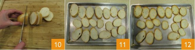 Enquanto isso, corte a baguete em fatias com cerca de 1 cm de espessura 10, coloque-as em uma assadeira 11 e torre no forno quente a 200° por cerca de 5 minutos 12.