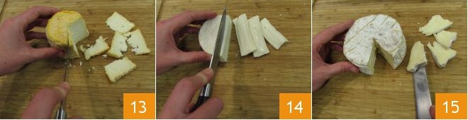 Por fim, passe para os queijos: corte o langres 13, o boursault 14 e o resit brebis e o camembert 15.