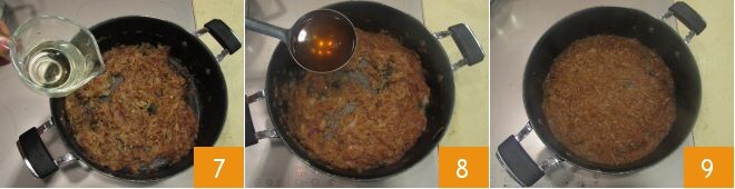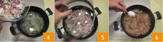 Em seguida, adicione as cebolas 4 e misture, cubra com a tampa e deixe cozinhar lentamente por cerca de meia hora em fogo baixo 5. Neste ponto, você deve refogar as cebolas, então aumente a temperatura e adicione o sal e o açúcar 6