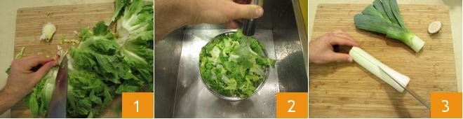 Para preparar a sopa de escarola e batatas, a primeira coisa que você deve fazer é o Caldo de legumes, depois passe para a limpeza dos vegetais. Divida a escarola ao meio, elimine o talo 1 e corte-a em tiras de cerca de 3-4 cm. Lave-a sob água corrente 2 e reserve. Passe para o alho-poró, elimine a parte verde e faça um corte vertical 3 para eliminar facilmente a primeira camada.