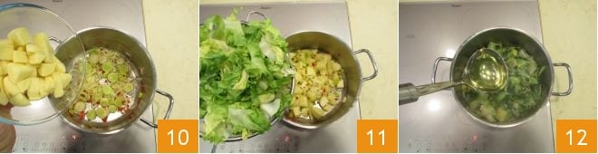 e adicione as batatas 10. Deixe-as pegar sabor por alguns instantes, então adicione também a escarola 11. Adicione bastante caldo 12 até cobrir tudo.