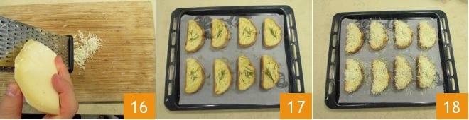 Enquanto isso, rale o caciocavallo 16 e assim que os croutons estiverem levemente dourados 17, use-o para cobri-los 18. Retorne ao forno por mais 2-3 minutos,