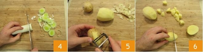 Em seguida, corte-o em rodelas 4 e passe para as batatas. Descasque-as 5 e corte-as em cubos de cerca de 2-3 cm 6.