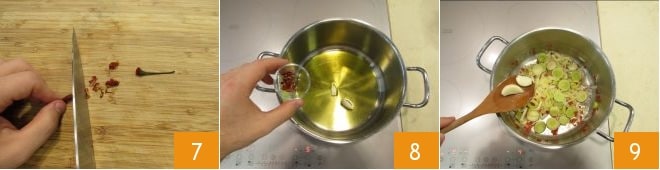 Por último, pique também a pimenta 7. Agora despeje um fio de azeite em uma panela, adicione os dentes de alho e a pimenta 8; aqueça e adicione também o alho-poró. Cozinhe por cerca de 4-5 minutos, mexendo de vez em quando, depois elimine o alho 9
