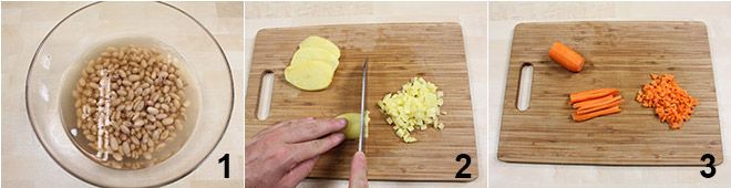 Para fazer a sopa de macarrão e borlotti, coloque os feijões borlotti de molho em bastante água fria por pelo menos 8 horas 1. Prepare o caldo de legumes e reserve (para saber mais sobre como preparar o caldo Caldo de legumes), depois limpe e lave os vegetais, em seguida corte em cubos finos as batatas 2, a cenoura 3,