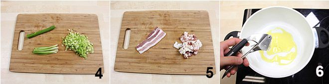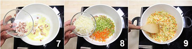 o aipo 4 e a cebola. Pique finamente a pancetta (ou toucinho) 5 e coloque para dourar um dente de alho esmagado com o azeite de oliva extravirgem.